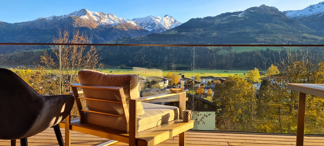 - riessiege Panorama-Terrasse mit Süd-Ausrichtung, Lounge-Möbeln und Liegen